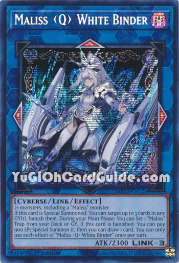 Text: | 2+ monsters, including a "Maliss" monster If this card is Special Summoned: You can target up to 3 cards in any GY(s); banish them. During your Main Phase: You can Set 1 "Maliss" Trap from your Deck or GY. If this card is banished: You can pay 900 LP; Special Summon it, then you can draw 1 card. You can only use each effect of "Maliss < Q > White Binder" once per turn. |