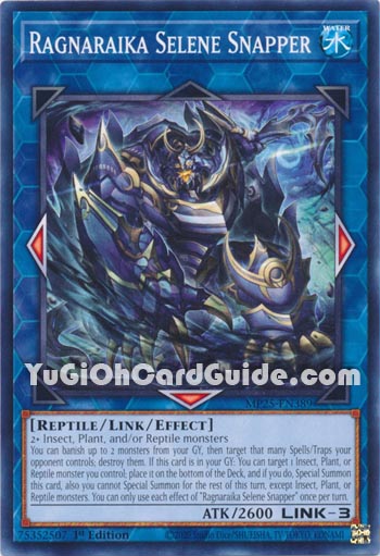Text: | 2+ Insect, Plant, and/or Reptile monsters You can banish up to 2 monsters from your GY, then target that many Spells/Traps your opponent controls; destroy them. If this card is in your GY: You can target 1 Insect, Plant, or Reptile monster you control; place it on the bottom of the Deck, and if you do, Special Summon this card, also you cannot Special Summon for the rest of this turn, except Insect, Plant, or Reptile monsters. You can only use each effect of "Ragnaraika Selene Snapper" once per turn. |